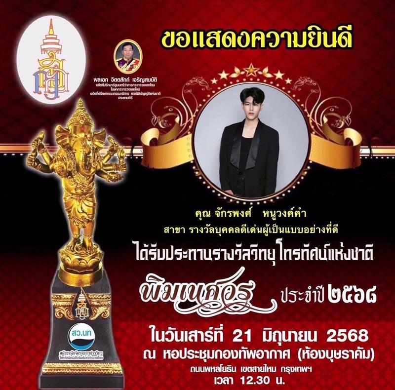 ขอแสดงความยินดีกับ นายจักรพงศ์ หนูวงค์คำ นักศึกษา ชั้นปีที่ 4 สาขาวิชาการสื่อสารดิจิทัล คณะสารสนเทศและการสื่อสาร มหาวิทยาลัยแม่โจ้ ในโอกาสได้รับรางวัลพิฆเณศวร ประจำปี 2568 สาขาบุคคลดีเด่นผู้เป็นแบบอย่างที่ดี ในงานประทานรางวัลวิทยุโทรทัศน์แห่งชาติ ครั้งที่ 13 ที่ผ่านมา
