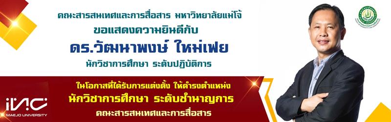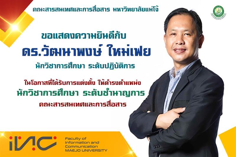 คณะสารสนเทศและการสื่อสาร มหาวิทยาลัยแม่โจ้ ขอแสดงความยินดีกับ ดร.วัฒนาพงษ์ ใหม่เฟย นักวิชาการศึกษา ระดับปฏิบัติการ ในโอกาสที่ได้รับการแต่งตั้ง ให้ดำรงตำแหน่งที่สูงขึ้น นักวิชาการศึกษา ระดับชำนาญการ คณะสารสนเทศและการสื่อสาร